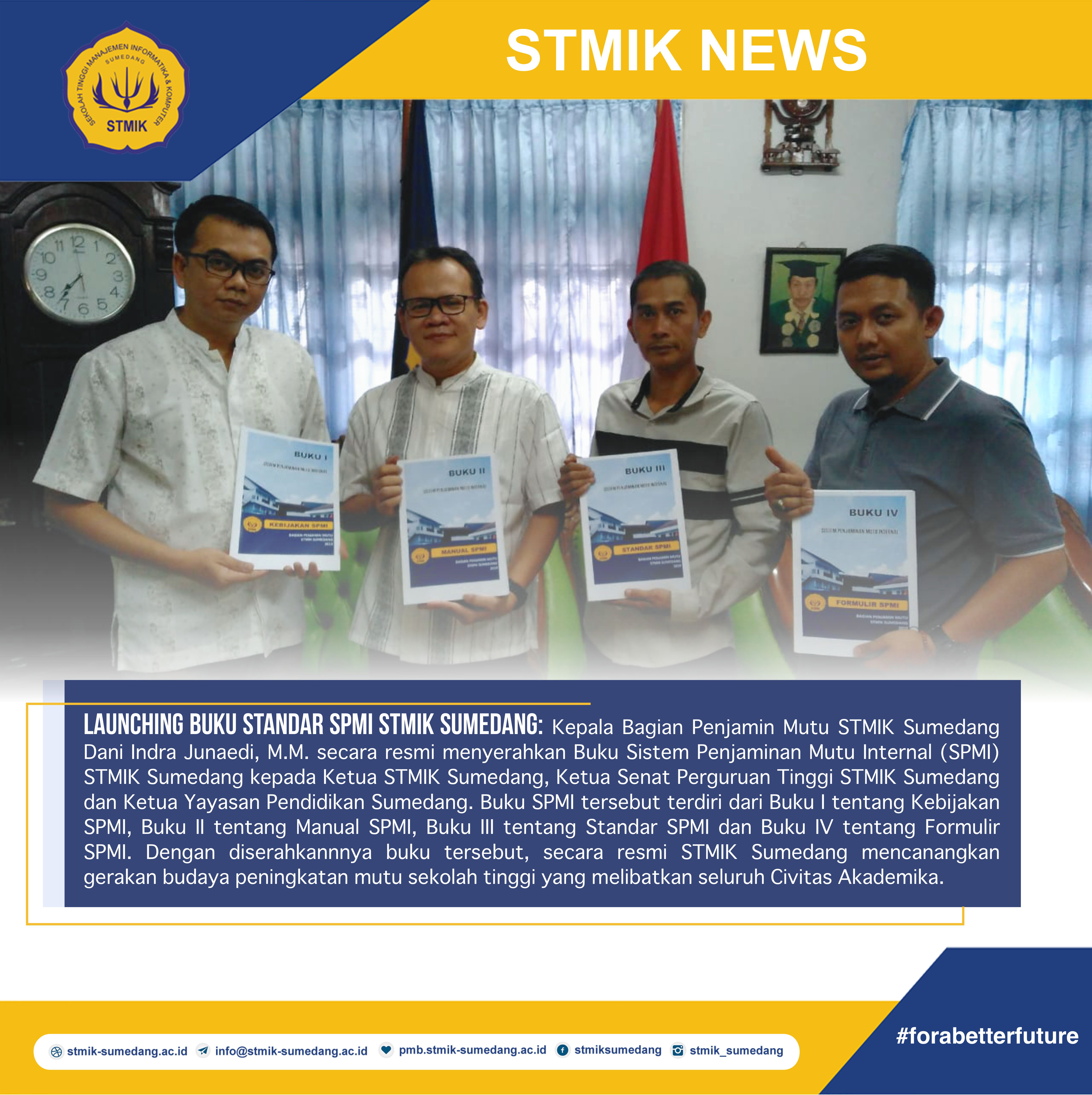 Kepala Bagian Penjamin Mutu STMIK Sumedang Dani Indra Junaedi, M.M. secara resmi menyerahkan Buku Sistem Penjaminan Mutu Internal (SPMI) STMIK Sumedang kepada Ketua STMIK Sumedang, Ketua Senat Perguruan Tinggi STMIK Sumedang dan Ketua Yayasan Pendidikan Sumedang. Buku SPMI tersebut terdiri dari Buku I tentang Kebijakan SPMI, Buku II tentang Manual SPMI, Buku III tentang Standar SPMI dan Buku IV tentang Formulir SPMI. Dengan diserahkannnya buku tersebut, secara resmi STMIK Sumedang mencanangkan gerakan budaya peningkatan mutu sekolah tinggi yang melibatkan seluruh Civitas Akademika.