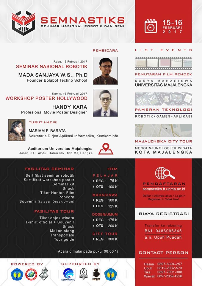 FASILITAS : Sertifikat Seminar Robotik, Sertfikat Workshop Poster, Seminar Kit, Snack, Tiket Nonton Film, Popcorn.
